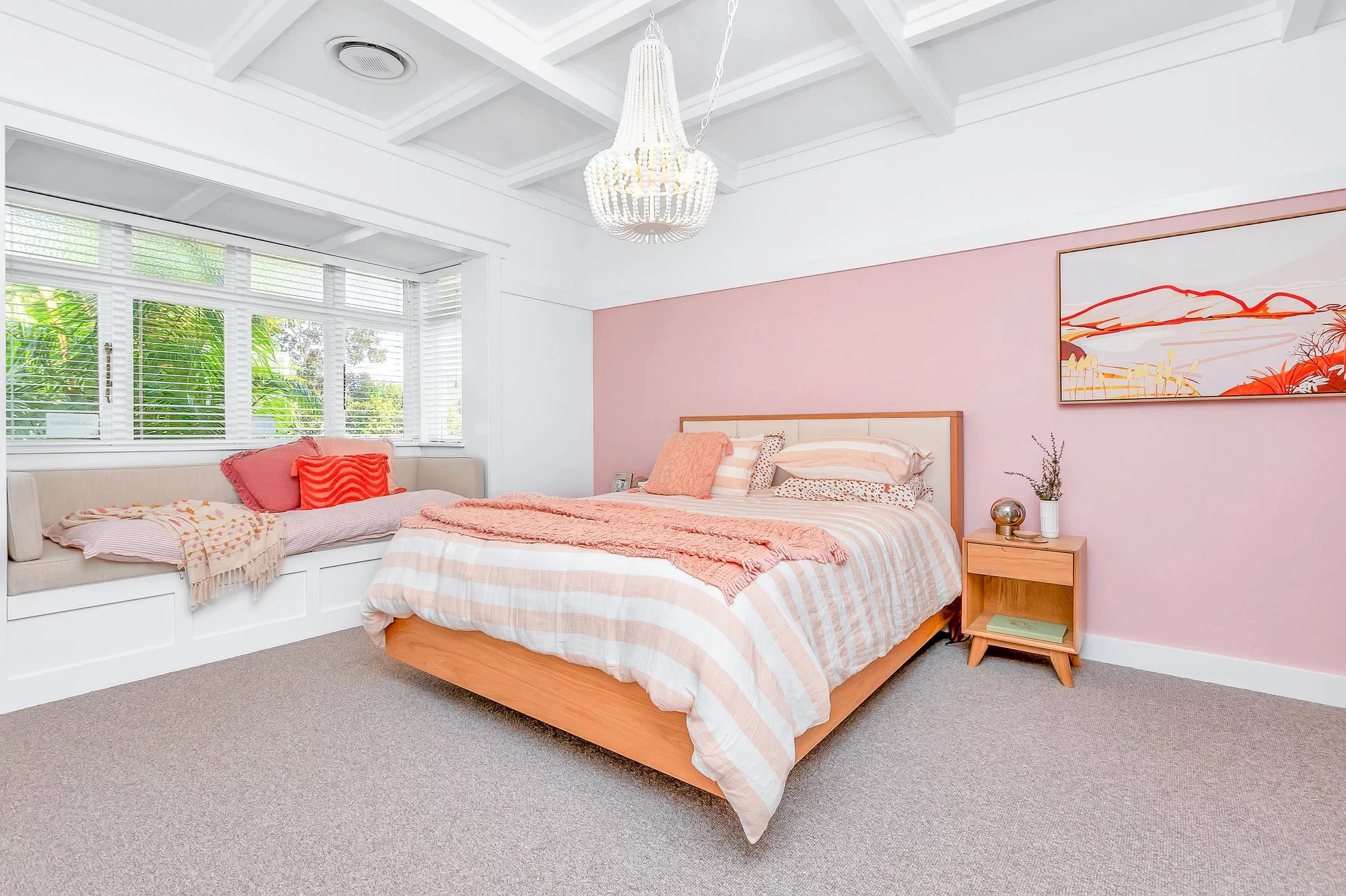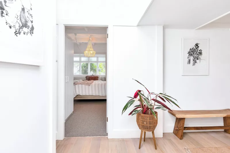 "Throughout the house we chose Resene Alabaster because it added the right amount of warmth. We decided to go a little bold with the dusky pink Resene Paper Doll feature wall in the master bedroom and ensuite door because it tied in perfectly with a Jen Sievers artwork we’d chosen for our bedroom. The landscape painting is of where we went on our first date 22 years ago, so it means a lot to us.
